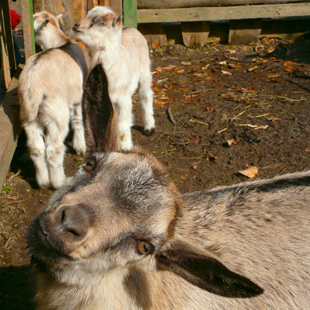 Dospelé zvedavo obzerajú foťák, či by škrípal medzi zubami a šteklia fotografov kozími briadkami po zápästí.