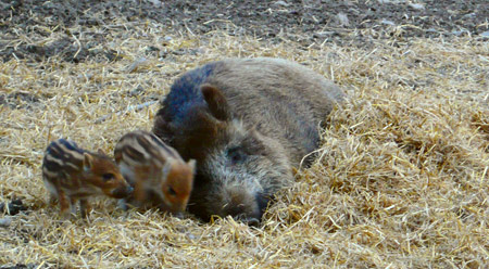 V kôpke sena sa povaľuje ďalšia sviňa. Keďže nie som prasiatkár, ale iba vtáčikár, tak neviem, či odpočíva po úspešnom odrodení, alebo sa naň iba schystáva. To sa ukáže zajtra, ak bude v ohrade viac mláďat, než dnešné štyri.