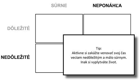 Ako príklad činností nedôležitých a neponáhľajúcich môže slúžiť sústavné polihovanie pri DVD filmoch, pedantné a časté upratovanie, dlhé zvažovanie, ktorá dečka sa hodí pod kvetináč… Ak človek stratí veľkú časť času plnením úloh z kvadrantu zbytočností, zvyčajne je to na úkor inej, dôležitejšej práce.