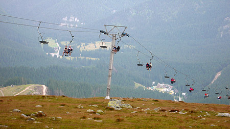Jedno z miest, kam sa dá pomocou drôtu a chôdze vyšplhať je Chopok. Kto to tam nepoznáte, tak to je taká hŕba kamenia na ktorej je zapichnutá drevená bakuľa s nápisom Chopok, na ktorú sa chodia dívať celé zástupy ľudí. Takže naša turistika začne ako sa patrí – na lanovke. Viem, turisti ma teraz prekľajú hlboko pod čiernu zem, ale čo mám roboť? Ja som viac spachtoš ako turista. Spali sme do druhej a to nie je práve najlepší čas začať s výstupom na Chopok a nazad. Bola by to už asi dosť tvrdá turistika s neistým koncom.