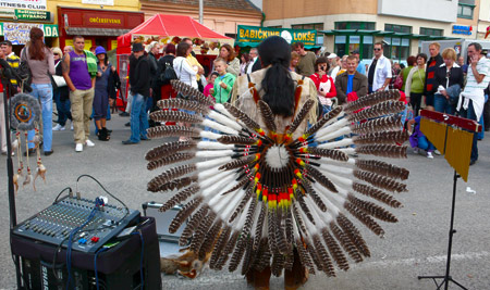 Tradične odetí fidlikanti predávali cédečká a hrali na plejbek.